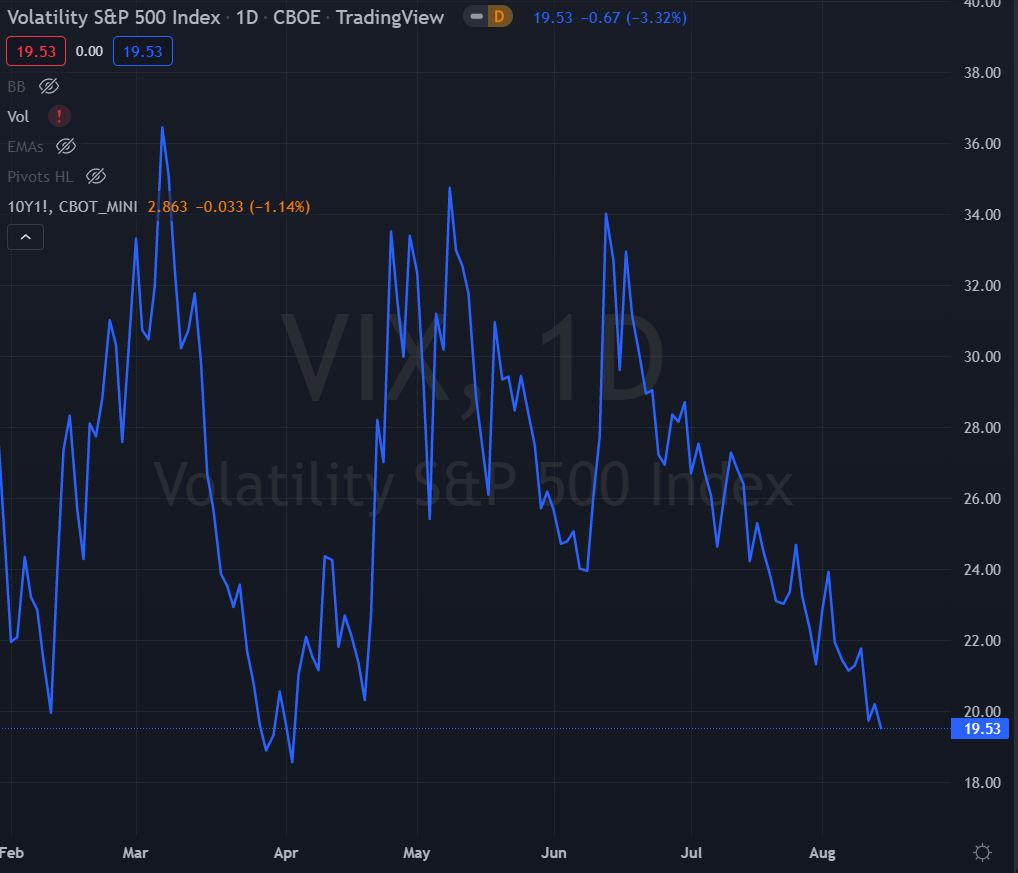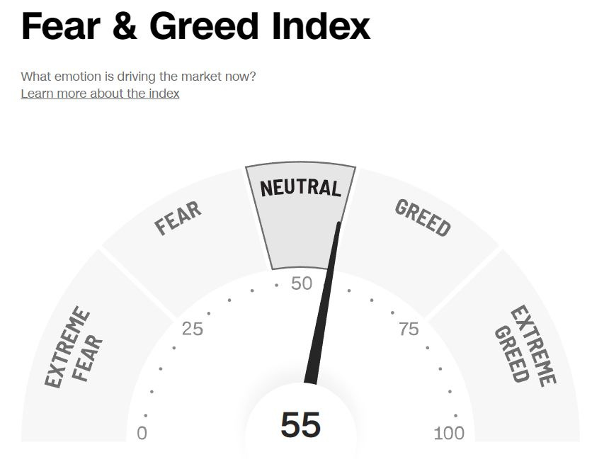 The VIX was down another 9.21% this week to lows not seen since April 4th, indicating less fear and volatility in the S&P 500 (or is that complacency?) The Fear & Greed Index moved from 50 to 55 (bordering on "Greed")