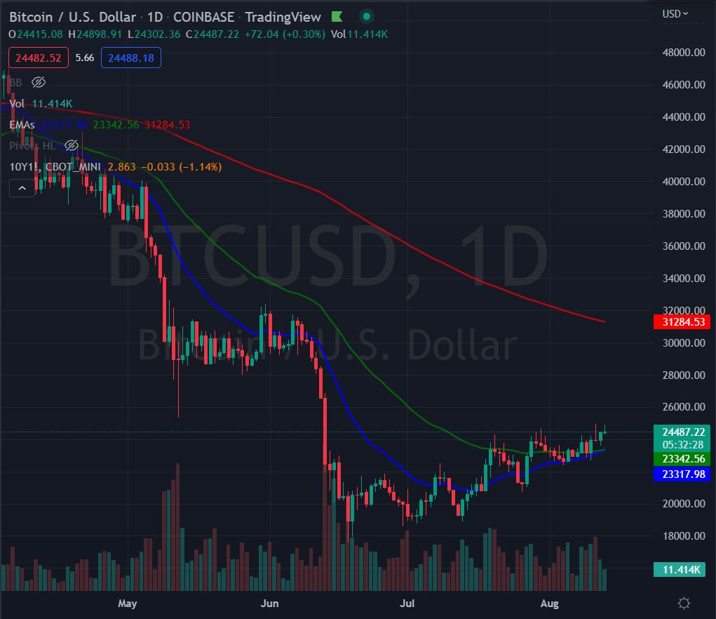 Note: In the graphs below: Red is the 200 EMA, Green is the 50 EMA, and Blue is the 20 EMA.