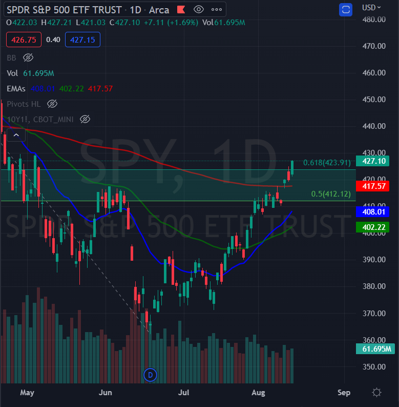 SPY was up 4.26% this week, an broke through the May through June highs, the 50% (412.12) and 61.8% (423.91) Fibonacci levels, as well as the red 200 day EMA (417.57).