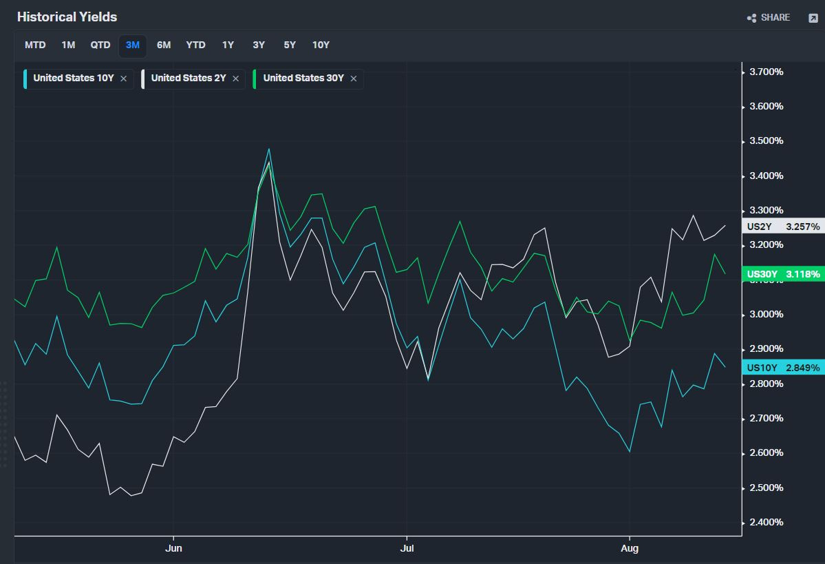 The 2 year (white) is still offering the highest yield at over 3.2%, while the 30 year (green) and the 10 year (blue) offer less -- an inverted state at ~20 year records. All rates remained in an upward trend this week, and their spreads widened.